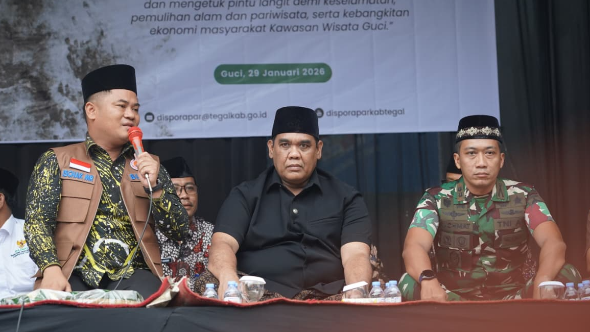 Pemerintah Kabupaten Tegal menggelar istighosah dan doa bersama di halaman kantor Unit Pelaksana Teknis Daerah (UPTD) Guci, Kecamatan Bumijawa, Kamis (29/1/2026). Kegiatan yang dihadiri jajaran Forkopimda, kepala Organisasi Perangkat Daerah (OPD), serta masyarakat ini menjadi momentum penegasan komitmen pemerintah daerah dalam mempercepat pemulihan infrastruktur pascabencana di kawasan wisata Guci.