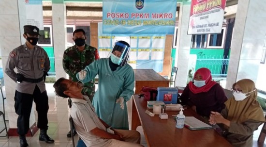 Margasari - Camat Margasari Sularko Bekti Raharjo melakukan langkah - langkah antisipasi pencegahan penyebaran Covid-19 menjelang lebaran dengan melakukan tes cepat (rapid test) antigen bagi warga masyarakat yang nekad mudik, bertempat di Balai Desa Prupuk Utara, Selasa (11/05/2021).