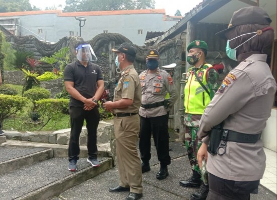 GUCI - Petugas Gabungan yang tergabung dalam satuan tugas percepatan Penanganan Covid-19 menegur sejumlah pengelola Pemandian Air di kawasan Wisata Guci yang masih beroperasi di tengah Pandemi.