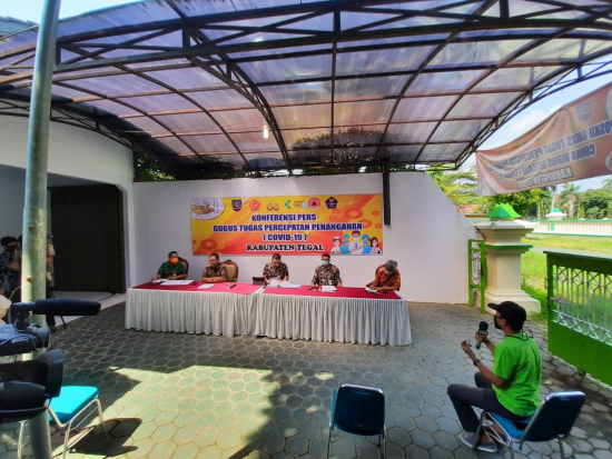 Slawi- Tim Gugus Tugas percepatan penanganan Covid 19 Kabupaten Tegal menyelenggarakan Pres Conference terkait Program dan kebijakan pemerintah daerah dalam penanganan pandemi Covid 19 kamis 14 Mei 2020 pukul 09.30 wib di Posko Gugus Tugas Kabupaten Tegal jln dr. Soetomo no. 1 Slawi .