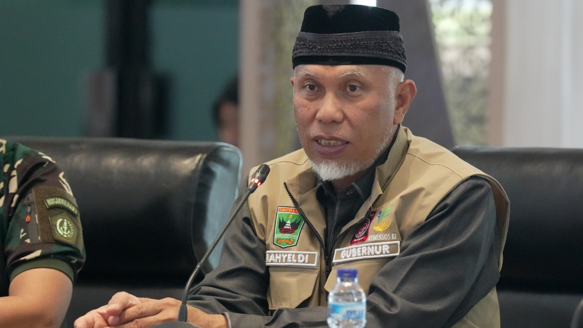 Gubernur Sumbar Mahyeldi Ansharullah saat memimpin rapat penanganan bencana di Posko Terpadu Penanggulangan Bencana Provinsi Sumbar, Padang, Minggu (7/12/2025). Ia menyampaikan bahwa perpanjangan status diperlukan karena sejumlah daerah masih menghadapi akses terputus, kebutuhan dasar, dan proses evakuasi yang belum selesai. (Foto: Noel/KPM Kemkomdigi)