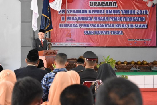 Slawi - Usai mengikuti upacara bendera Peringatan Ulang Tahun Ke-74 Republik Indonesia, Wakil Bupati Tegal Sabilillah Ardie bertolak menuju Lapas Kelas IIB Slawi untuk memberikan remisi kepada 222 narapidana, Sabtu (17/8). Pemberian remisi kepada narapidana ini dilakukan dalam rangka Hari Kemerdekaan Ke-74 RI.